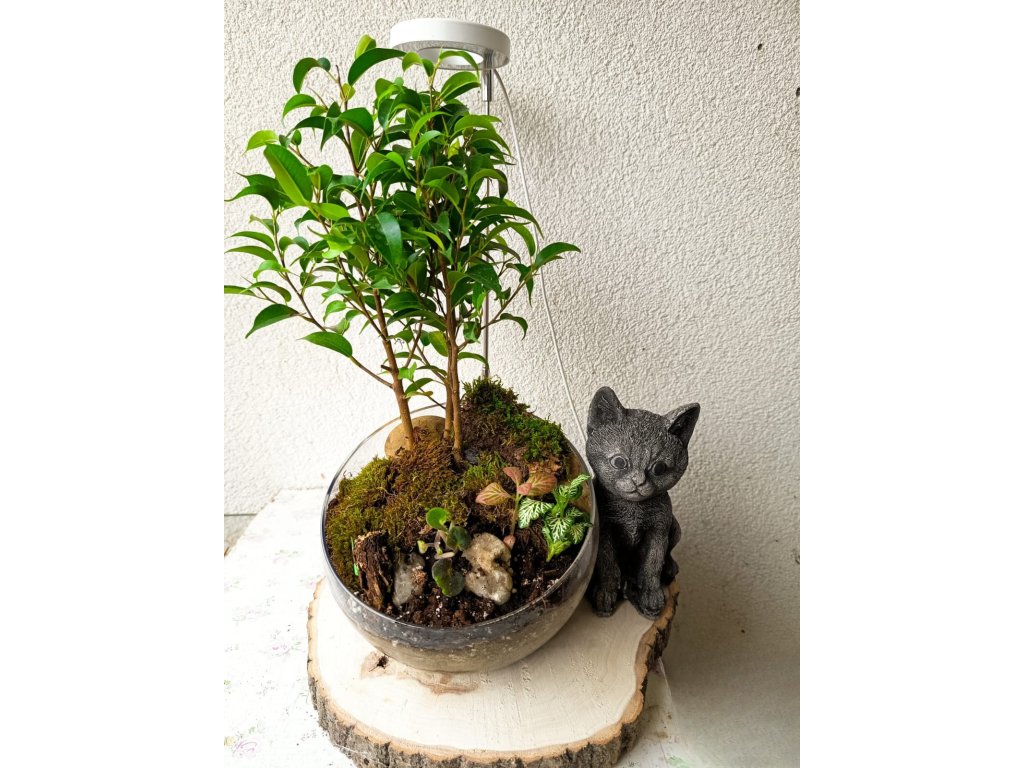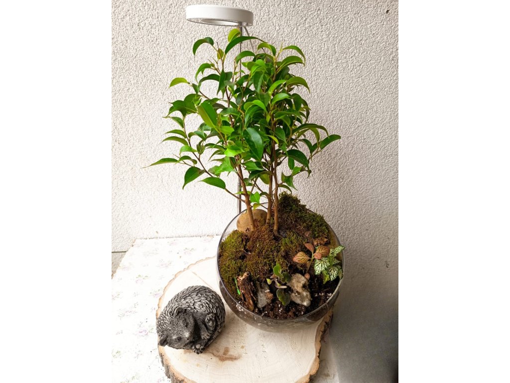 Dopřejte svému domovu kapku klidu a inspirace s tímto okouzlujícím minilesem ve skleněné nádobě. Hlavní roli hraje elegantní bonsai Ficus benjamina, jehož svěží listy vytvářejí pocit opravdového miniaturního lesa. Vše doplňuje hebký mech, drobné rostlinky i úlomky dřeva, které spolu harmonicky ladí.