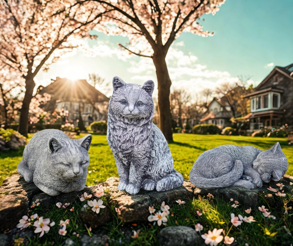 Tahle spící kočička z betonu vypadá tak přirozeně, že byste ji chtěli pohladit. Svraštělá tlapička, klidný postoj, dokonalé detaily srsti — jako by si jen tak zdřímla ve stínu levandule a zapomněla na celý svět.